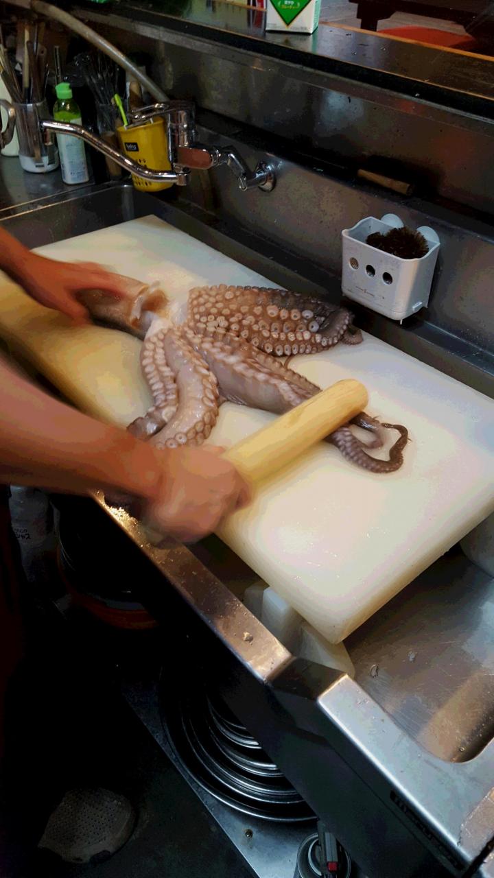 シンクから逃げ出そうとするタコの頭をひっくり返し、棒で叩き、茹であげるのはいつも壮絶な戦いです(笑)